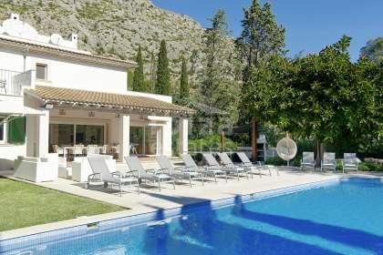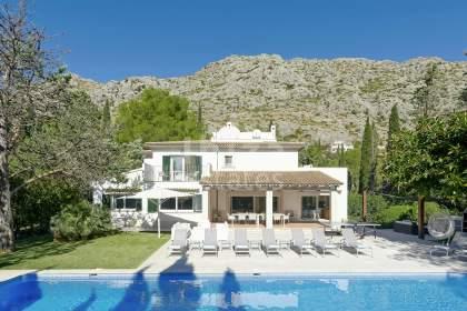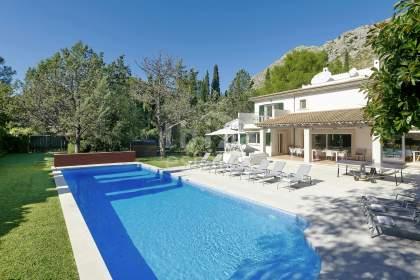 Villa Estevez sits at the foot of the stunning UNESCO Tramuntana mountains in the quiet highly sought after area of La Font, Pollensa. This family holiday home located in the North East of the island is a 50 minute drive from Palma Airport, just a short walk from Pollensa town, and a 10-minute drive to Port de Pollenca where you will find stunning beaches, boats, restaurants, bars and shopping. With 5 large bedrooms, each with their own bathroom and 3 with balconies, all of which offer stunning views of the surrounding area, this villa is the ideal holiday destination for a large family or for two families with children. The rear garden boasts a 15-metre, salt-water, heated swimming pool, with electric pool-cover. In the South East corner of the garden, you'll find a large relaxing Bali-bed and Hammock areas surrounded with exotic tropical plants, a wonderful place to relax in the afternoons and watch the sun go down over the mountains. On entering, you'll be greeted by a breathtaking hallway with sweeping stairs and designer ambient lighting, leading through to a bright open plan lounge, dining area, kitchen, a self-contained utility room and private snug/playroom. ​The kitchen, with large island/breakfast bar, has everything you need including a large oven, gas stove microwave, dishwasher, large fridge, Nespresso and tons of kitchen gadgets for juicing, smoothie making etc. along with a solid wood dining table that accommodates 10 for breakfast lunch and dinner. ​The connecting utility room has a washing machine, tumble dryer, large American style fridge freezer and a separate sink/drainer. ​The Snug is the hub of entertainment, with a 50" UHD 4K TV, Streaming UK TV, Blu-ray player, tons of films, stacks of board games & puzzles (for all ages), a selection of superb books, a comfy L-shaped sofa, coffee table and a pool/snooker table that flips over into an air-hockey table. Downstairs you will find two bedrooms, while upstairs leads to three more bedrooms; all bedrooms have their own bathroom, black-out blinds, plenty of storage with built-in wardrobes, cabinets and draws. Two of the master bedrooms (one upstairs, one downstairs) have a safe mounted discreetly in the wardrobe. The house has high-speed internet, so you'll enjoy connected living throughout the house and into the gardens. The house boasts air conditioning and central heating throughout and is secured by a monitored security alarm.