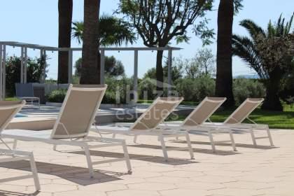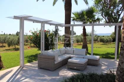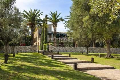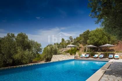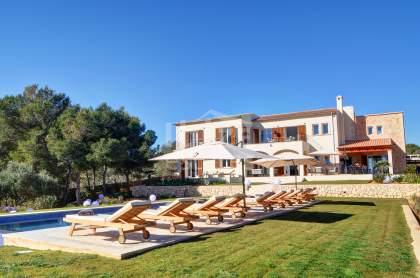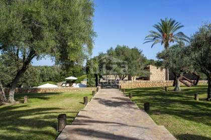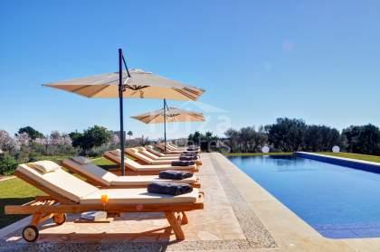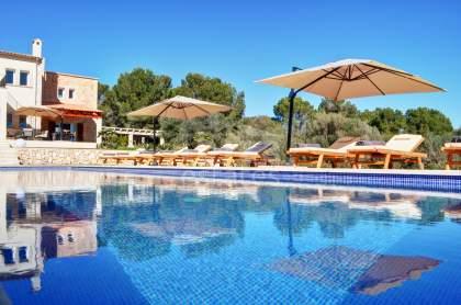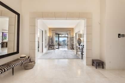This spacious, newly built house boasts distant sea views and offers 6 double bedrooms, each with its own en-suite bathroom. The rooms are furnished to a high standard with designer furniture and great style, offering lots of charm and homeliness. This exclusive peaceful oasis, protected and secluded on the East side of the island, is just 3 km away from the village of Porto Colom, it is in an ideal spot to wander off on excursions to explore the beautiful island. The elegant furnished living room offers all the amenities for unforgettable moments with friends and family. It has cosy upholstered sofas and armchairs, a huge full HD Television and sound system for indoor and outdoor use. The fully equipped newly designed, high-quality white gloss kitchen offers the ideal place to create Mediterranean cuisine during your stay. Both the kitchen and the living room lead directly to the spacious terrace – nestled between fragrant lavender and citrus trees. The beautifully maintained Mediterranean garden has been created with much love and in the evening is illuminated. Outdoor areas offer a large 14m x 8m pool, surrounded by sun beds and parasols and a yoga area. The terraces and the covered barbecue area with a large professional grill, serves as a great outdoor lounge area to relax and unwind as well as to eat together al-fresco. Positioned on 1.6 hectares of land with air conditioning and heating throughout, there is also a laundry room with washer and tumble dryer.