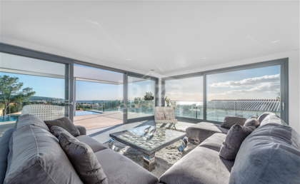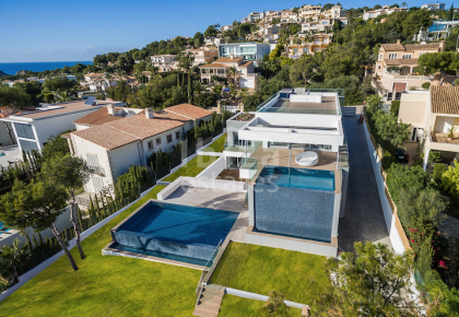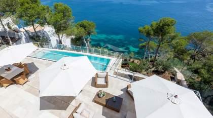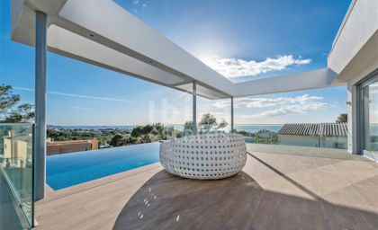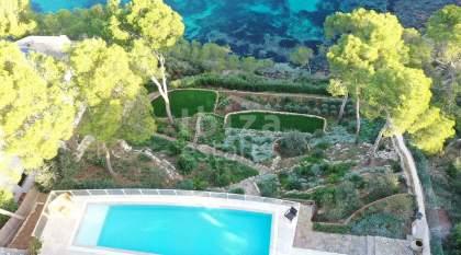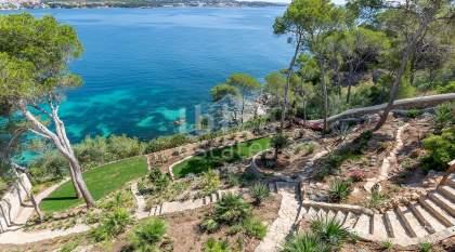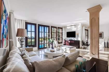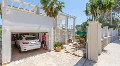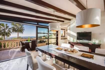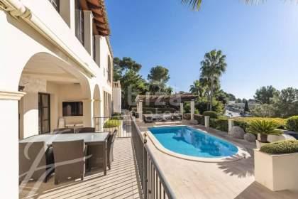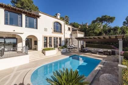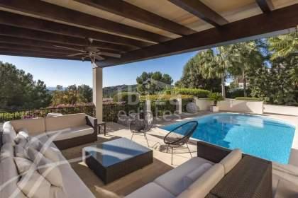 Luxurious, peacefully located stone estate with a pool and mountain views. Luxury villa located in Calvia with mountain views This breathtaking estate was meticulously renovated in 2012 using only the finest materials, creating a true masterpiece in the style of an English country house. Set on a sprawling plot of over 3 hectares, the single-story residence offers complete seclusion and boasts luxurious interiors. A guesthouse, horse stables, and a paddock further enhance the property. Located near the charming village of Calvia, the estate offers stunning views of the picturesque countryside. The village center is within walking distance and offers charming cafés, delightful restaurants, and boutiques. Additionally, the vibrant coastal towns of the southwest, with their numerous amenities, several golf courses, breathtaking beaches, and marinas, are just a short drive away. The southwest facing main house features a spacious living and dining area with double height ceilings, a well equipped kitchen with a central cooking island and dining area, four bedrooms, three bathrooms, a guest WC, a utility room, and a storage room. From the living room and kitchen, you have access to the charming terrace areas, which lead into the beautifully landscaped garden with a swimming pool. The guesthouse completes the property with a living room, open kitchen, two bedrooms, and a bathroom.